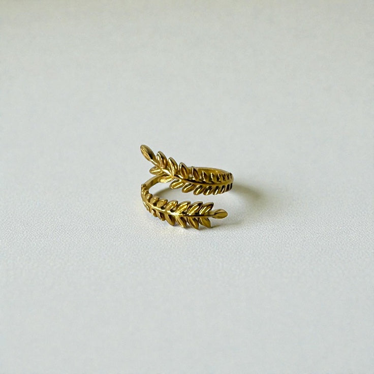 Delicate yet effortlessly bold, the Golden Laurel Wrap Ring is designed to feel like a soft statement on your hand. Inspired by natural laurel leaves, its graceful wrap silhouette adds texture, shine, and a touch of quiet luxury to any look—perfect for everyday wear or layered with your favorite stack.